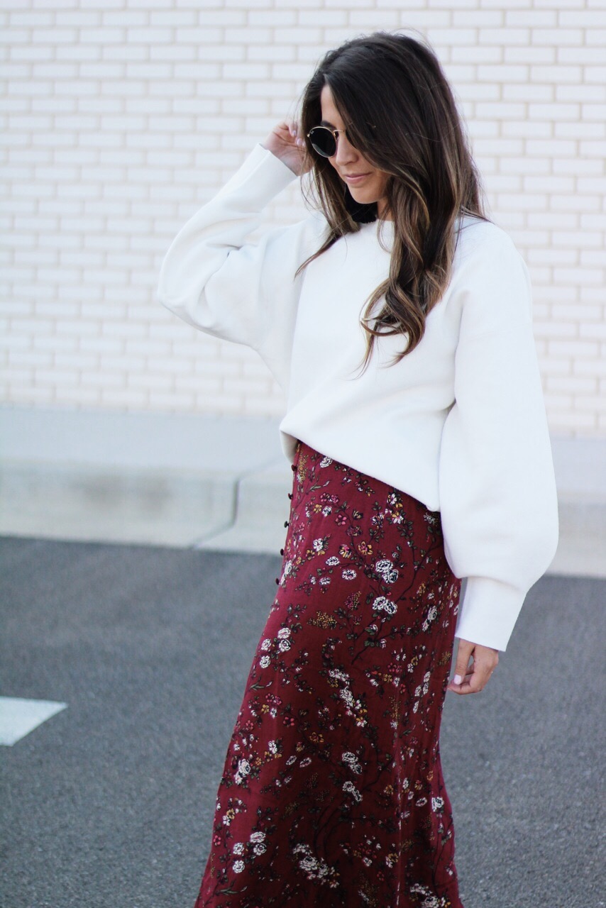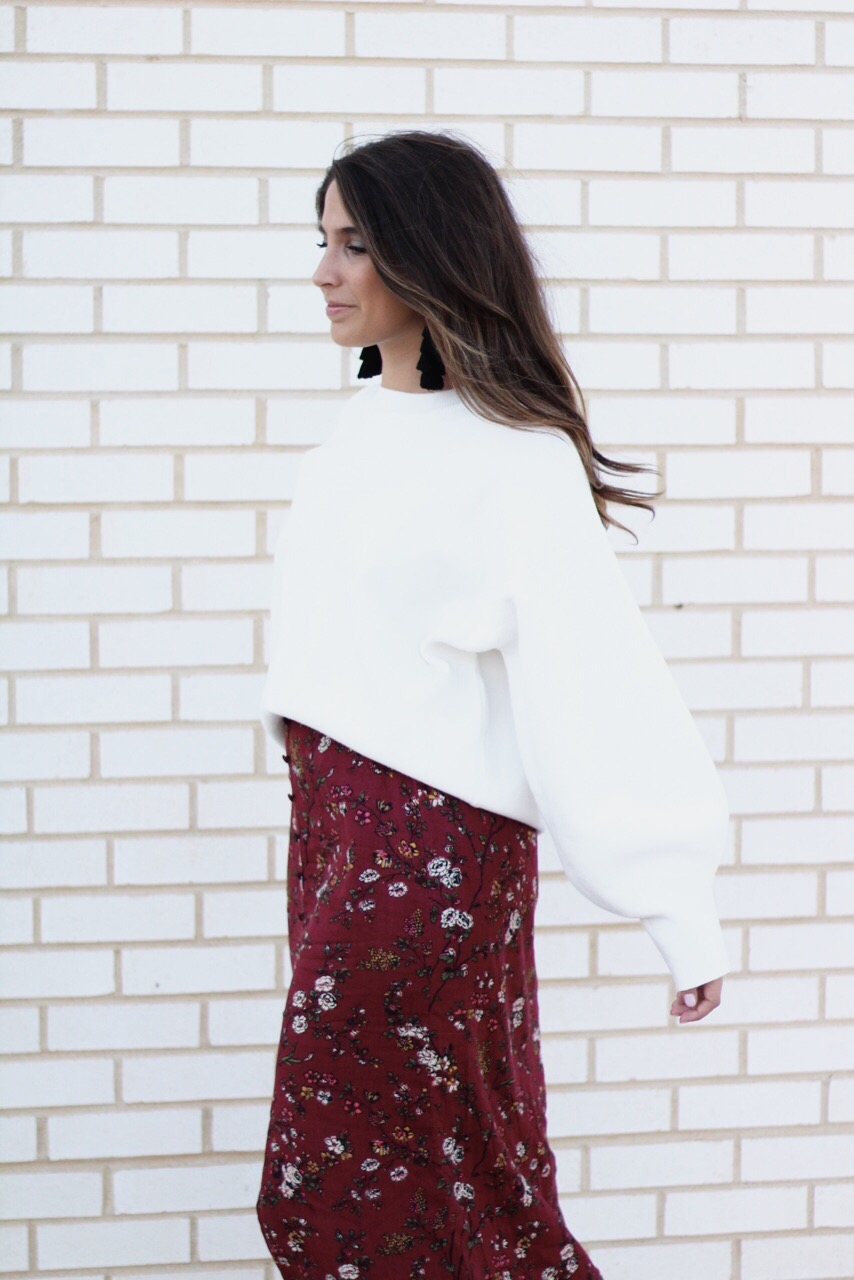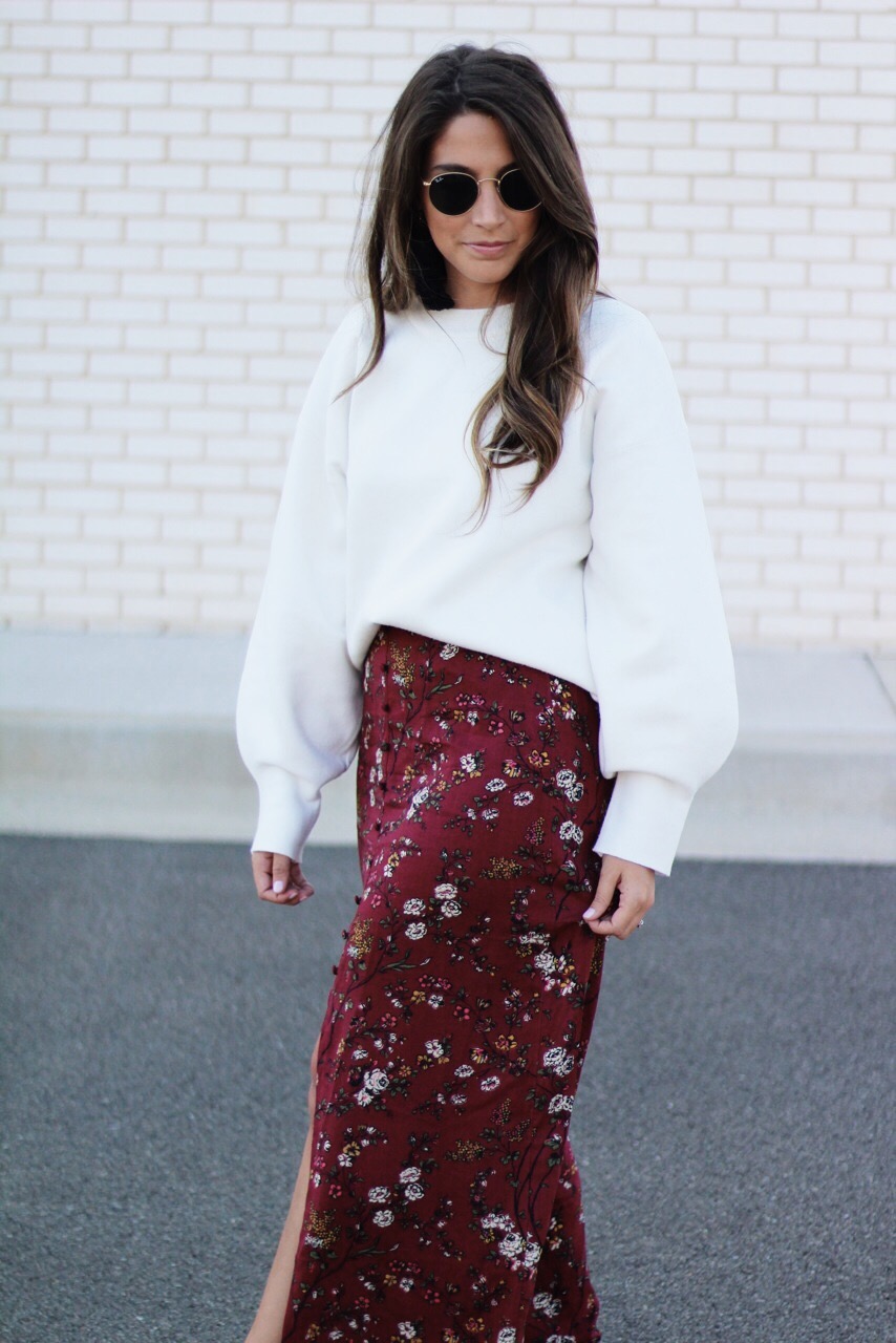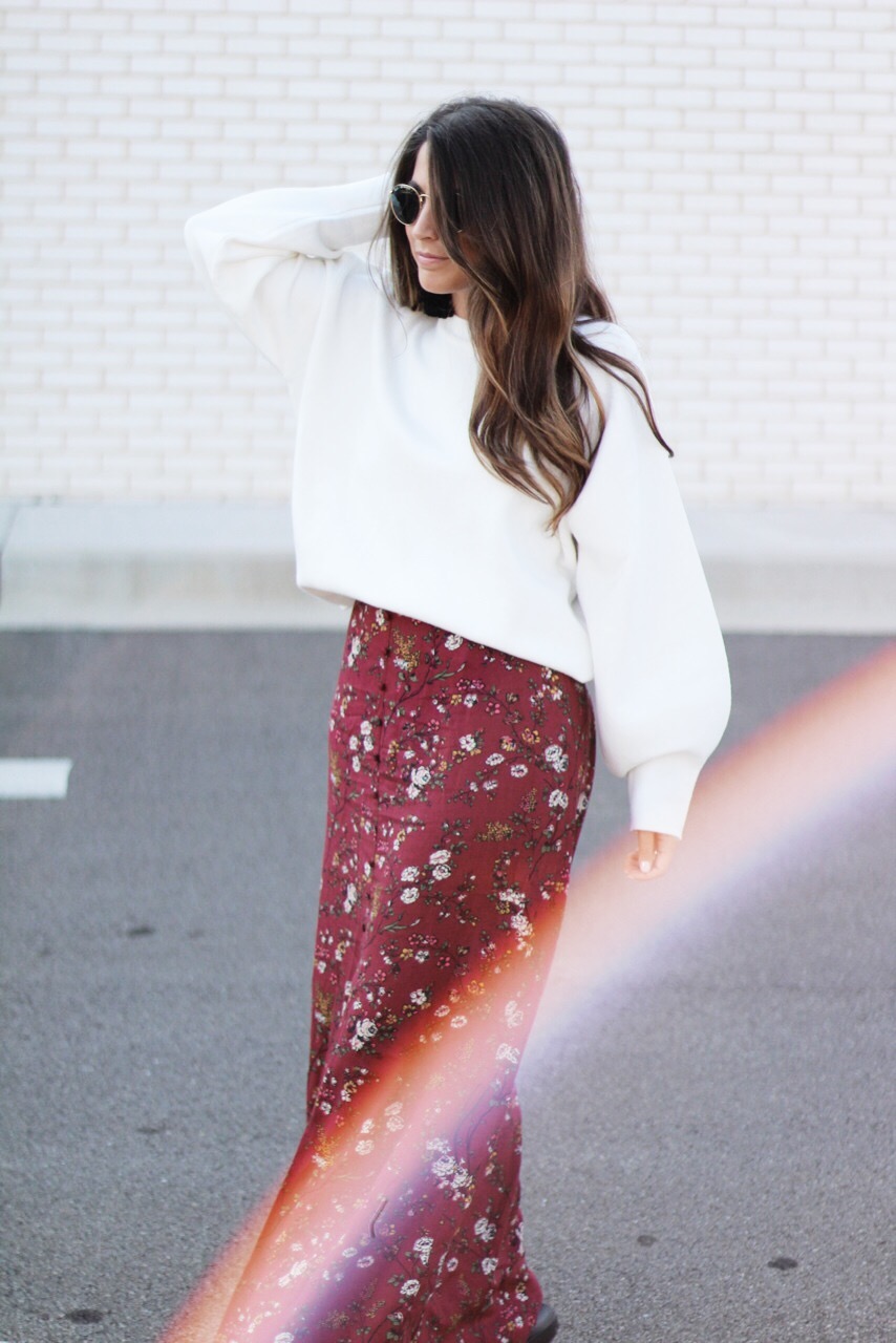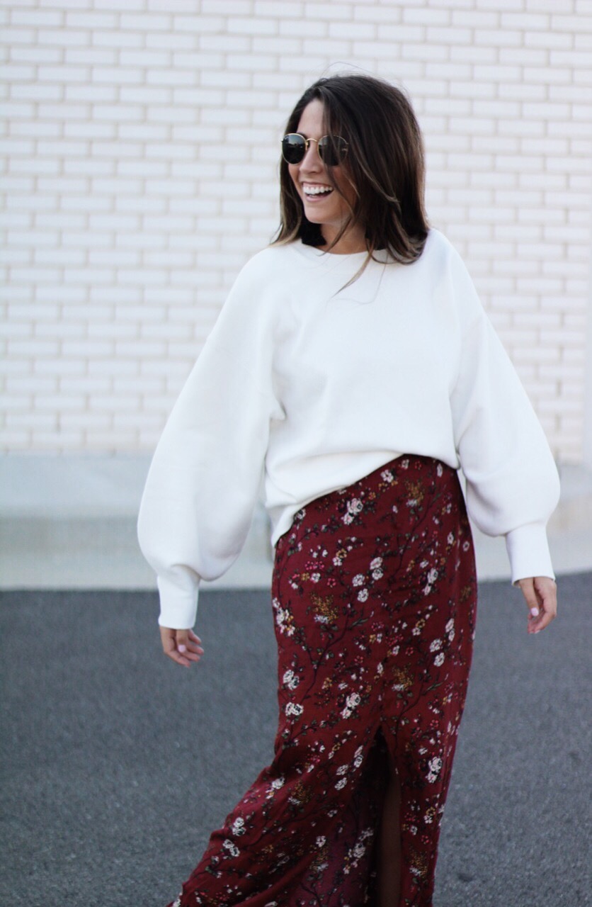 This Fall, my goal is to start wearing more maxi skirts! I never really been a fan of them  because of my height but, I recently found this maxi skirt at Target and I have fallen in love! The color and the floral print brings in a classic and sassy style. The front button and slit adds drama and romance that draws attention. I  topped it off with this balloon sleeve sweater from H&M!  Check out the the pictures below to purchase these fun items! I promise you will LOVE!