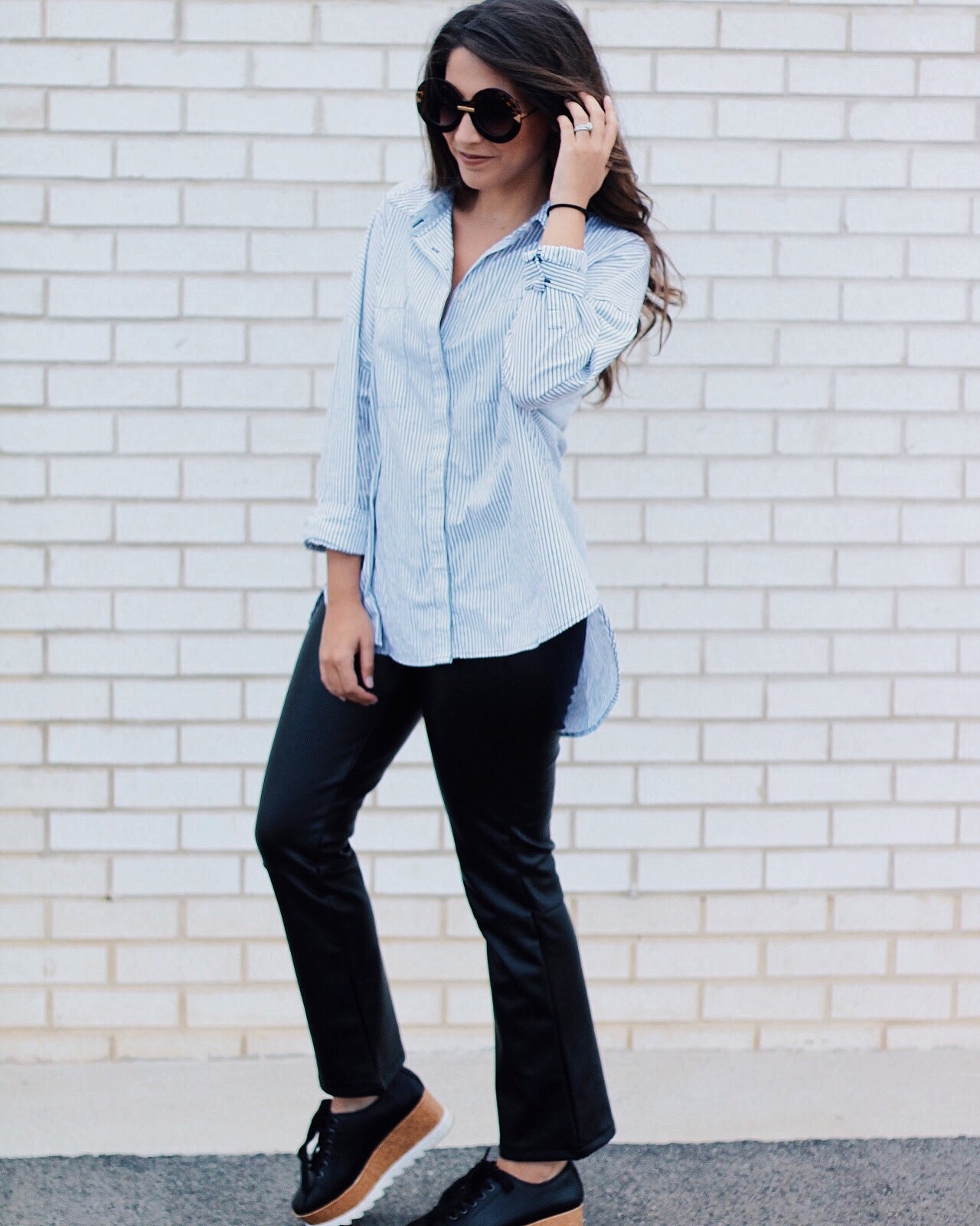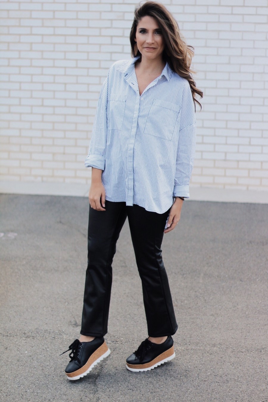 YOU GUYS! I finally found the perfect faux leather pants from The Who What Wear collab at Target! They are actually very comfortable and they feel so soft… I know kind of strange because they are faux, but the quality is great! I paired them with an oversized button down from another Target Collab called A New Day. Another fun part about this outfit are the handcraft earrings from Wire and Hide. These leather earrings are such a classic piece to any outfit.